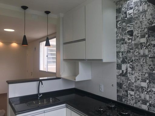 Apartamento á venda, sala com painel e teto rebaixado com gesso e spots, cozinha com armários embutidos e cooktop, quartos com armários embutidos, banheiro com box e pia e armário de pedra.