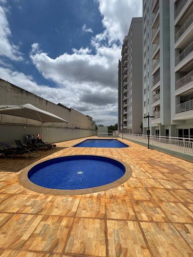 Condomínio com lazer completo, piscinas, academia, sauna, salão de festas, quadra poliesportiva, salão de jogos e playground.