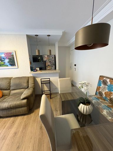 Sala de estar integrada com sala de jantar e cozinha toda planejada