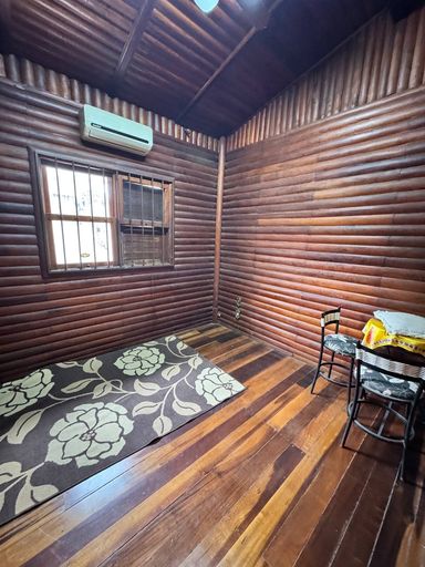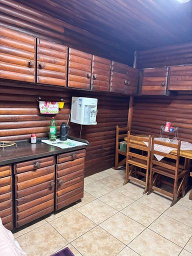 A cozinha também é rústica e conta com armários.