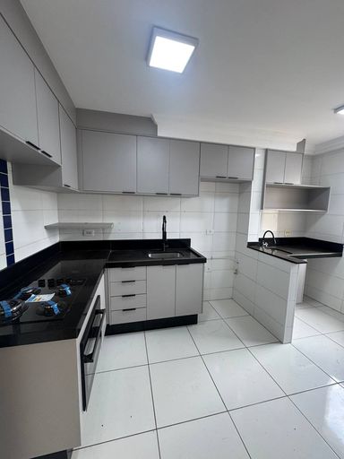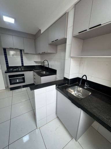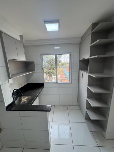 Cozinha planejada com cooktop e forno, 2 dormitórios repleto de ármarios, 1 banheiro também com ármario, 1 garagem fixa e descoberta.