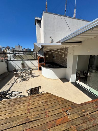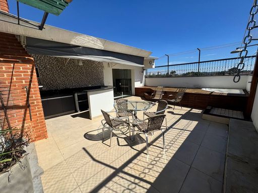 Na parte superior ficam a segunda sala (que também possui ar condicionado), a segunda suite (totalmente reformada) e a ampla área gourmet que conta com churrasqueira, pia completa com armários, chuveirão e deck com Jacuzzi. Esta área também sofreu uma reforma em sua cobertura, em toda a parte hidráulica e acabamentos.