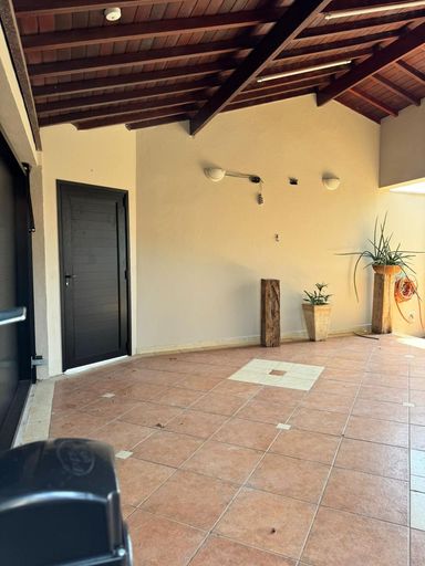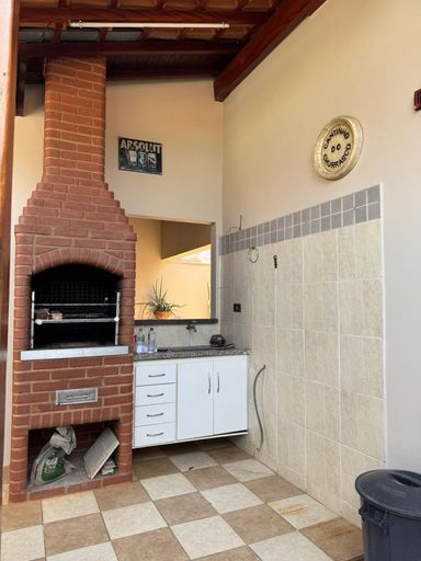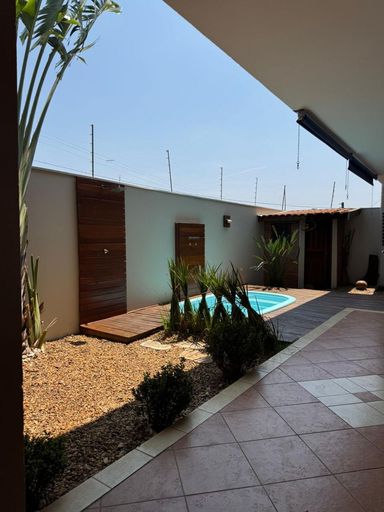 Área gourmet com churrasqueira e piscina, 3 banheiros no total, 2 vagas cobertas, jardim e área de serviço.
